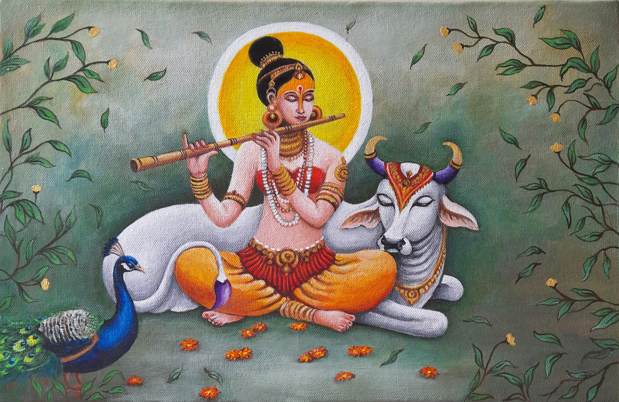 ORIGINAL PAINTING KRISHNA RAJA RAVI VARMA CHILDROOM MAA SARSWATI DYANA MONK RAJE SHIVAJI LOVE SWAMI VIVEKANANDA DATTA GURU SHIVA NATURE EVOLUTION STILL LIFE – SOLD MELODIES OF VRINDAVAN KRISHNA LORD DHANVANTARI SHIV SHANKER NAGRA